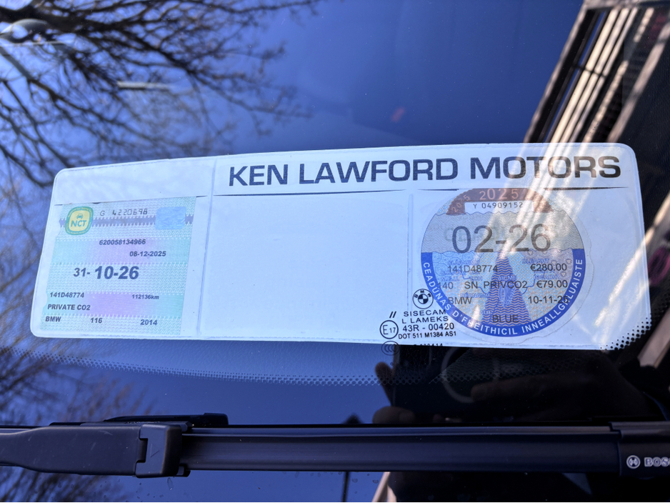 Tiny Mileage 116i M-Sport with Full M Sport Bodystyling, Alcantara Sports Seats, 18" Alloy Wheels, Privacy Glass, Reversing Camera, Rear Parking Sensors, Sat Nav, Bluetooth with Music Sreaming, Dual Z ... one Climate Control, Cruise Control, LED Headlights, and Auto Headlights and Wipers. NCT Passed Till 10/26. Road Tax €280py. Finance is available on this car at competitive rates, Please ask our sales team for a quotation. Ken Lawford Motors Est. 1991.