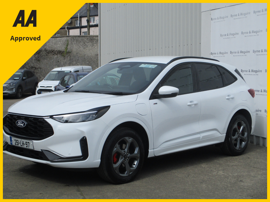THIS 2025 DEMO FORD KUGA 2.5 PHEV ST LINE IS STUNNING IN FROZEN WHITE AND COMES PREPARED TO THE HIGHEST STANDARD SERVICED IN OUR FORD APPROVED WORKSHOP VALETED INSIDE AND OUT AND FULLY GUARANTEED W ... ITH A NATIONWIDE 12 MONTH AA ROADSIDE ASSISTANCE COVER. TRADE IN WELCOME AND FINANCE ARRANGED. RETAIL PRICE OF €46,950 OR CASH PRICE OF €45,950. CALL BRENDAN ON 0872051161 Air Conditioning, Central Locking, Immaculate condition, Electric Windows, Airbag, Alarm, Alloy Wheels, Cruise Control, Electric Mirrors, Fog Lamps, Immobiliser, Rear Spoiler, Privacy Glass, Automatic Wipers, Centre Armrest, Multi-function steering wheel, Roof Rails, Climate Control, Satellite Navigation, Traction Control, Multiple Air Bags, Anti-Theft System, Parking Sensors, 12 Month Warranty, Bluetooth, Remote Central Locking, Isofix, History Checked, Apple Car Play, Android Auto, Space Saver Spare Wheel, Wireless Smartphone Control, Active Safety Braking / City Brake / Collision Alert, Stop/Start Button, Dual Zone Climate Control, Daytime Running Lights, 2 Keys, External Devices Connectivity, Cup holders, Stability control