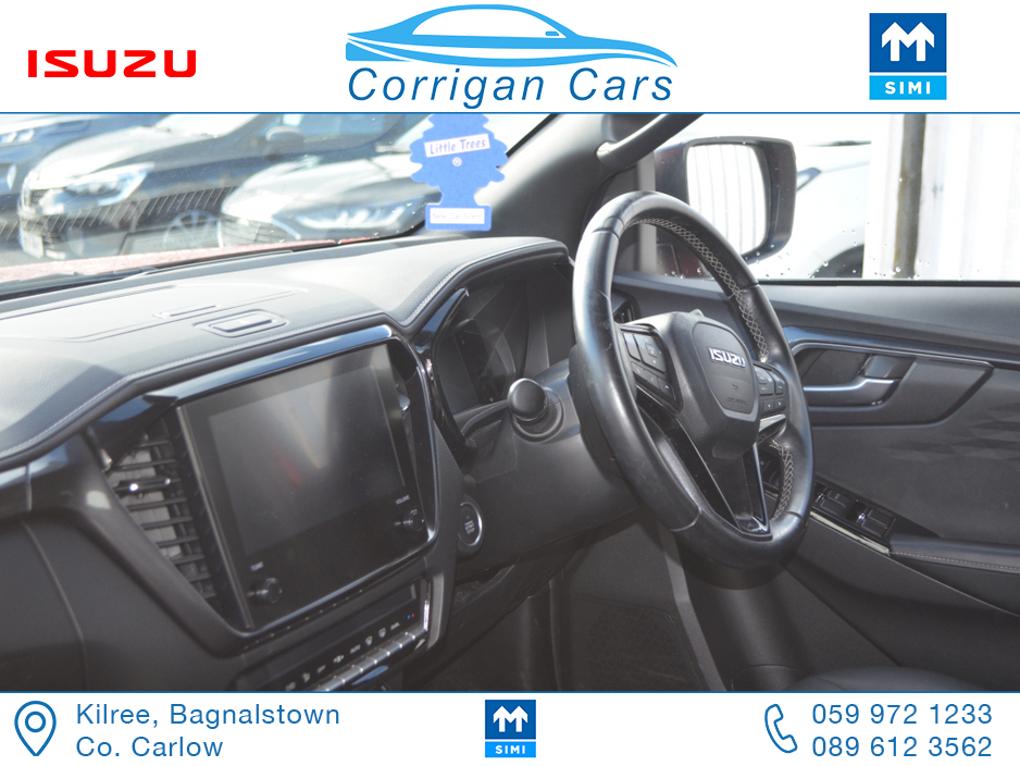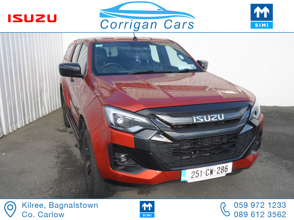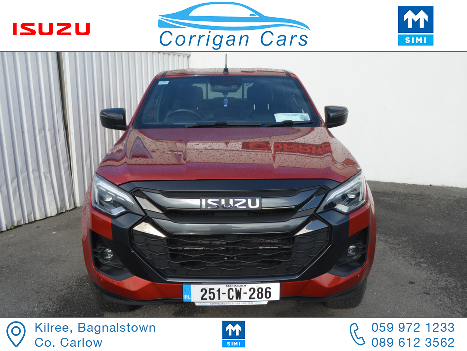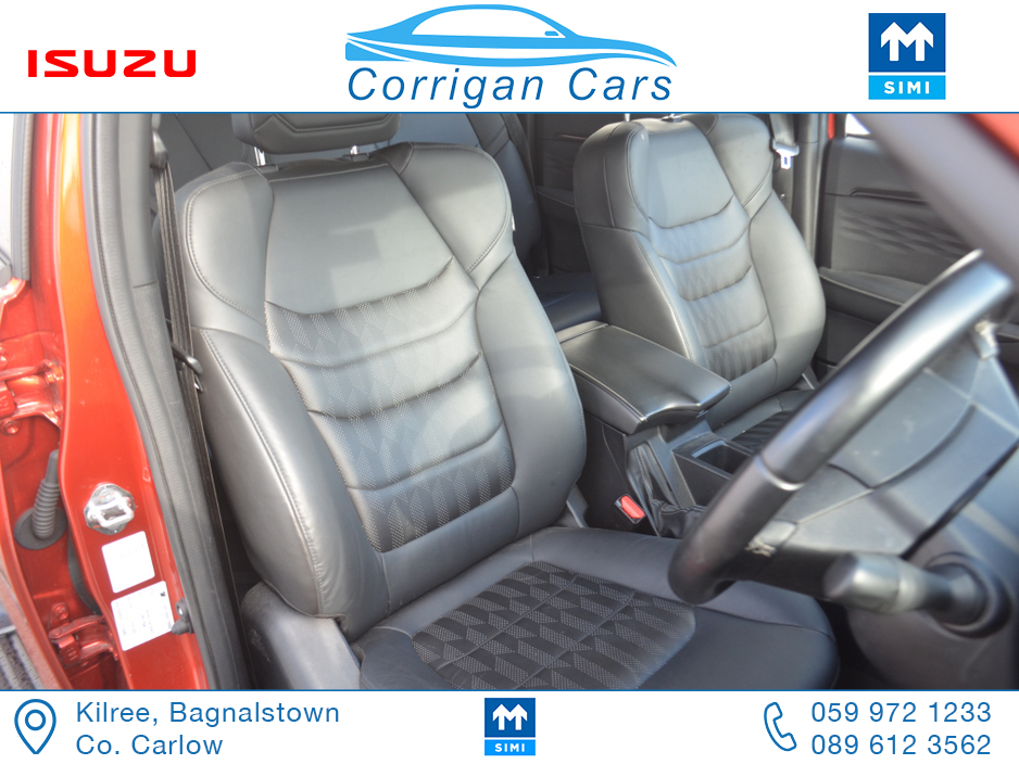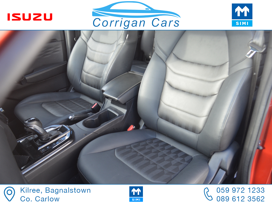 This jeep new retails at €62,500 so this jeep is a bargain at €53,995 including vat with only 8700kms and 4 years Isuzu Warranty. PRICE EXCLUDING VAT €43,898- New into Corrigancars is this Stunn ... ing LSE D-Max Presented in Namibu red, super spec on this jeep including Air Con, Bluetooth, Heated Leather Seats, Reverse Camera, Apple Carplay, Blind Spot monitoring, Lane Departure warning and lots lots more. Lo rate finance available in house on this jeep with a vat deposit and trade ins most welcome. All our commercial Vehicles are sold fully serviced, DOE Tested, History Checked and with a comprehensive warranty. For more details or to arrange a test drive please Willie on 086 8376909 landline 059 9721233 or email sales@corrigancars.ie Central Locking, Electric Windows, Airbag, Cruise Control, Fog Lamps, Privacy Glass, Centre Armrest, Multi-function steering wheel, Traction Control, Parking Sensors, Bluetooth, Isofix, Apple Car Play, Android Auto, Active Safety Braking / City Brake / Collision Alert, Stop/Start Button, External Devices Connectivity, Cup holders, Stability control, Air Conditioning, Air bags, Anti theft system, Bluetooth, Central locking, Cruise control, Electric windows, Fog lights, Multi Function Steering Wheel Controls, Parking Sensors, Power steering, Roof Rails, Traction control (ASR)