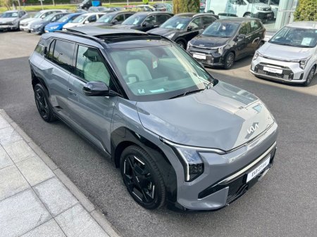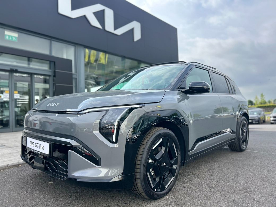 KIA EV3 GT Line, Finished in Shale Grey, Features include, 19" GT Line Alloys, Electric tilt and slide sunroof, L.E.D projection headlights, GT Styling pack, Privacy rear glass, Front and rear sensors ... with reverse camera, Keyless entry with push button start, Vegan leather interior, Heated Seats front and rear, Heated steering wheel, Heated rear seats, Double 12.3 touchscreen displays, Android auto and apple car play, wireless phone charger, Digital key, Adaptive cruise control, Speed limit assist and lane keep assist, Blindspot monitor, Heat pump, 81.4KWh battery giving up to 585km range.