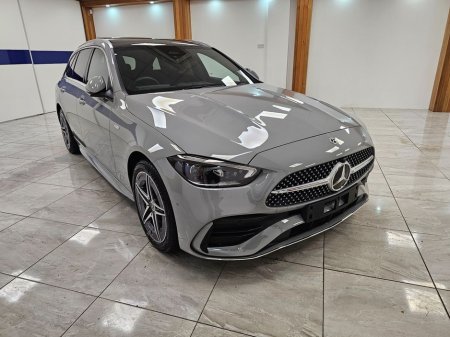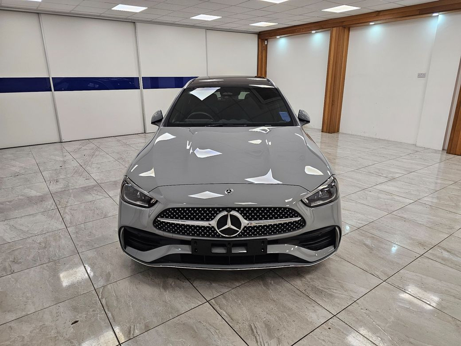 This is a 2025 Mercedes C300e AMG Premium Plus in Alpine grey metallic with black leather interior and an ash wood finish