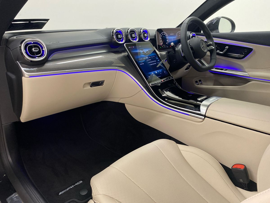 Additional highlights include the automatic panoramic sliding sunroof, KEYLESS-GO and KEYLESS-Start, Premium ambient lighting, MBUX Navigation Premium with Live Traffic, road sign recognition, and 19" AMG multi-spoke alloy wheels with mixed summer tyres. The Comfort Suspension, level control, and tire pressure monitoring system further enhance ride quality and safety.
