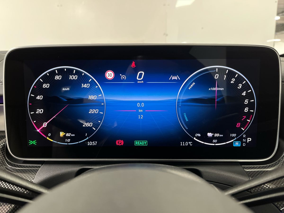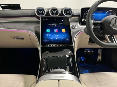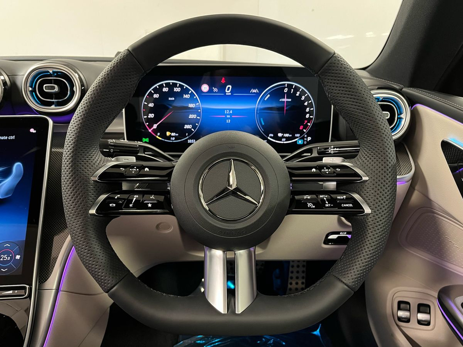 d advanced technology. The cabin offers premium comfort with heated front seats, AMG Line interior styling, a large central display, ambient lighting and a leather-clad dashboard. High-demand options include the panoramic sliding sunroof, AMG exterior styling, 19-inch AMG multi-spoke alloy wheels, Parking Package with rear-view camera, Blind Spot Monitoring, Active Lane Keeping Assist and the Memory Package for both front seats. This plug-in hybrid model benefits from MBUX Premium navigation, smartphone integration, wireless charging, multi-phase AC charging, Mode 3 charging cable, KEYLESS-GO and folding mirrors. Comfort suspension, level control, EV remote services, and advanced safety systems such as PRE-SAFE®, intersection monitoring and collision prevention ensure a refined and secure driving experience. Powered by the 2.0-litre M254 engine paired with hybrid technology and a smooth 9-speed automatic transmission, the CLE 300 e offers exceptional efficiency without compromising performance.
