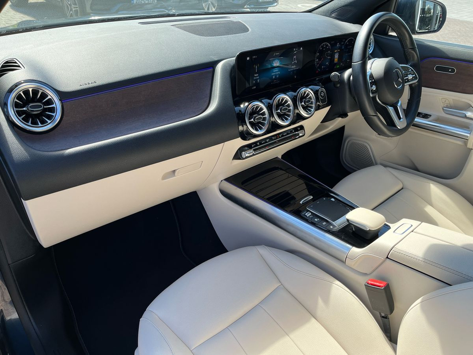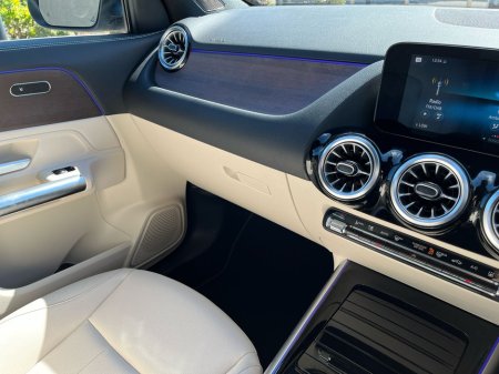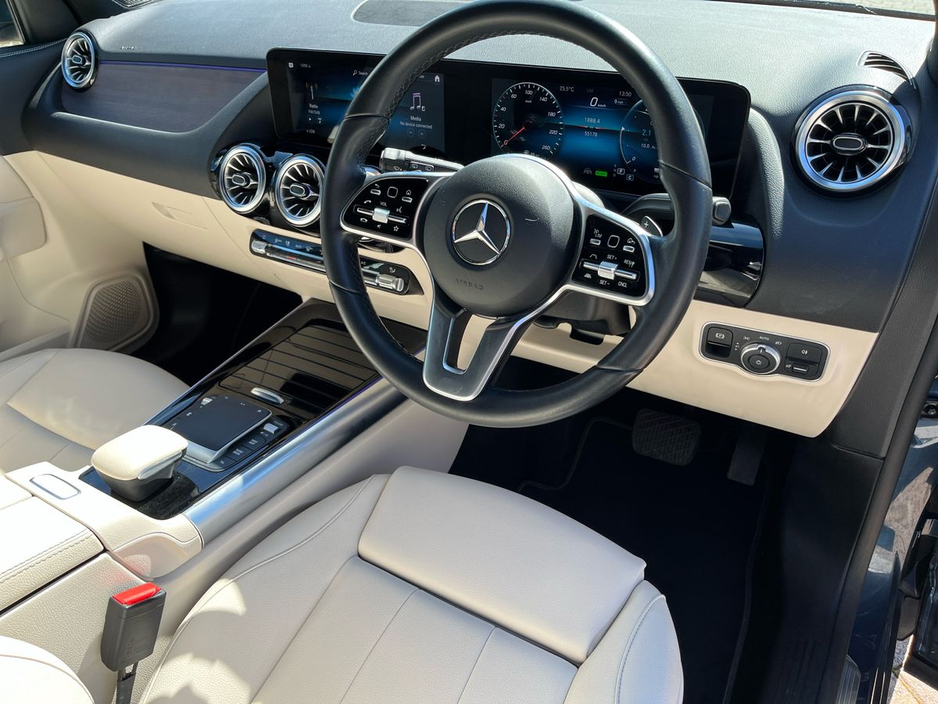 Finished in denim blue metallic paint, this GLA features a macchiato beige and black ARTICO leather interior with a black fabric roof liner and open-pore walnut wood trim. Desirable options include the EASY-PACK electric tailgate, heated front seats, ambient lighting, and the Advanced-Plus Package. The MBUX multimedia system with smartphone integration, digital instrument display, and touchpad interface ensures seamless connectivity and intuitive control. The 18-inch 5-twin-spoke alloy wheels and polished aluminium roof rails add a touch of elegance to this compact yet capable SUV.
