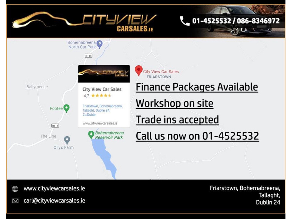WE ARE AUTHORISED CREDIT INTERMEDIARIES AND FINANCE CAN BE ARRANGED QUICKLY (POOR CREDIT HISTORY OR NO PREVIOUS CREDIT HISTORY IS NOT A PROBLEM). WHY NOT TRY OUR NO OBLIGATION ONLINE FINANCE APPLICATION AT OUR WEBSITE - WWW.CITYVIEWCARSALES.IE