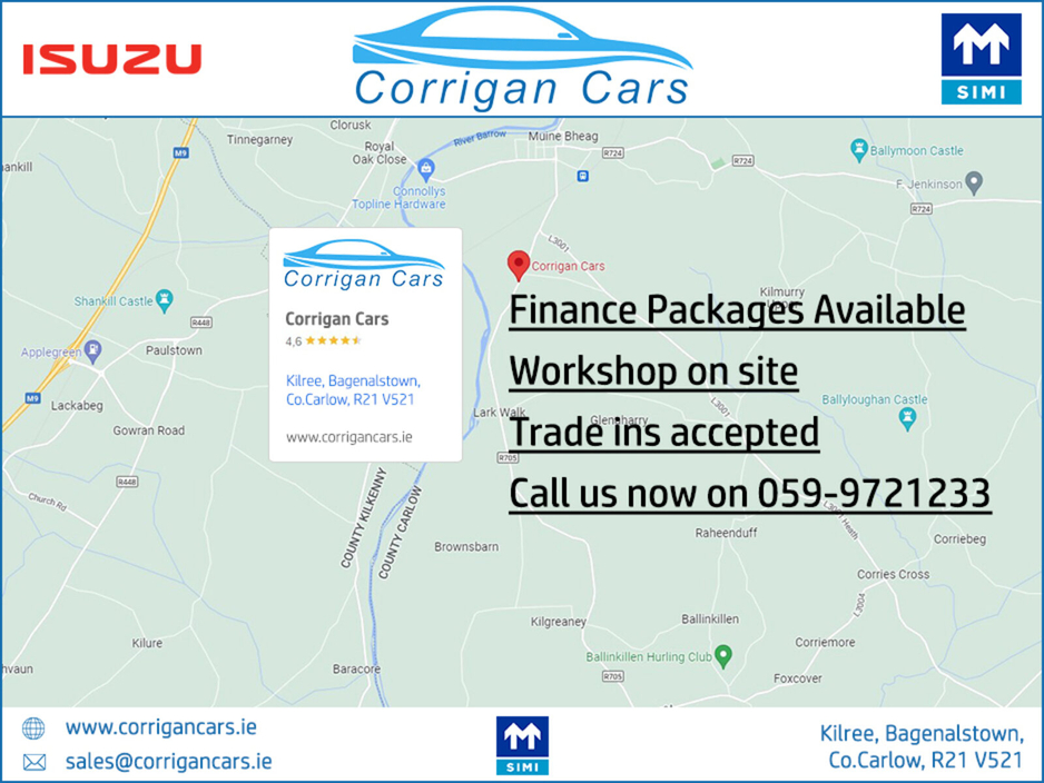 For more details or to arrange a test drive please call Willie on 086 8376909 landline 059 9721233 or email sales@corrigancars.ie Central Locking, Electric Windows, Airbag, Rear Spoiler, Centre Armres ... t, Multi-function steering wheel, Roof Rails, Satellite Navigation, Traction Control, Metallic Paint, Parking Sensors, 6 Month Warranty, Bluetooth, EBD, Isofix, Active Safety Braking / City Brake / Collision Alert, Stop/Start Button, External Devices Connectivity, Cup holders, Remote boot/hatch/rear door release, Stability control
