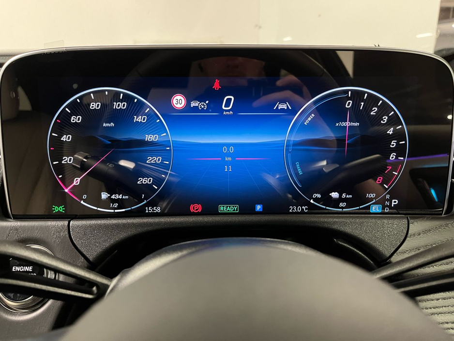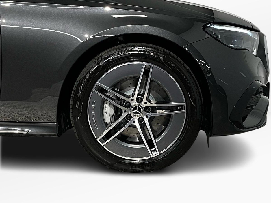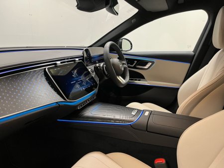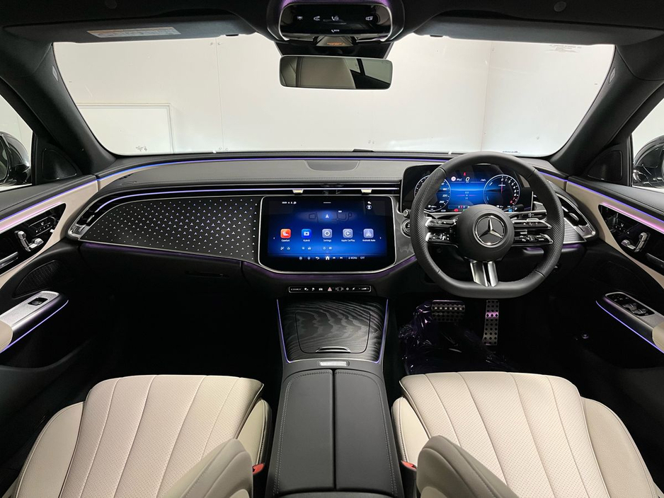 fined beige imitation leather upholstery complemented by open-grained black ash wood trim with illuminated Mercedes-Benz pattern accents. Desirable highlights include the AMG Line styling (interior and exterior), a panoramic suite of assistance systems such as DISTRONIC adaptive cruise control, Active Lane Keeping Assist, and a 360° camera for complete driving confidence. The car is equipped with the latest MBUX Navigation Premium system with Augmented Reality and a large central display, wireless phone charging, ambient lighting, and heated front seats. Ride comfort is enhanced by comfort suspension and the advanced hybrid powertrain, delivering seamless performance with plug-in efficiency. With 19" AMG double-spoke alloy wheels, KEYLESS-GO, Blind Spot Monitoring, and a luxurious specification throughout, this E-Class plug-in hybrid strikes the perfect balance between sustainability, technology, and sophistication.