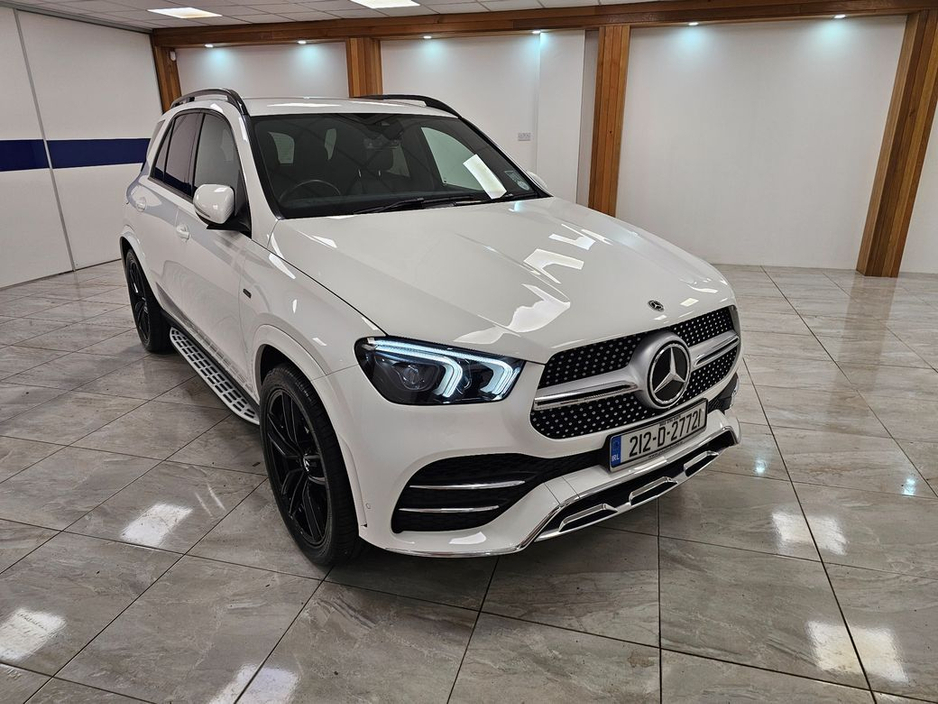 This is a 2021 Mercedes GLE 350DE AMG in mineral white metallic with a black leather interior and a wood finish
