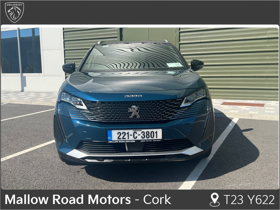 In stock at our Peugeot Showroom at Kilnap , Old Mallow Road , Cork City T23 Y622. Please contact Peugeot Sales @ 021 4392066 to organise a test drive or viewing . Electric Windows, Alarm, Alloy Wheel ... s, Electric Mirrors, Immobiliser, Privacy Glass, Automatic Wipers, Automatic Lights, Centre Armrest, Multi-function steering wheel, Roof Rails, Satellite Navigation, Traction Control, Metallic Paint, Multiple Air Bags, Anti-Theft System, Parking Sensors, Bluetooth, EBD, Electronic handbrake, Folding rear seats, Six speed transmission, Isofix, Apple Car Play, Android Auto, Keyless Entry, Reversing Camera, Motorised Tailgate, Front Parking Sensors, Lane Departure Warning, Blind Spot Monitoring System, Speed Sign Recognition & Recommendation, Active Safety Braking / City Brake / Collision Alert, Adaptive Cruise Control, Stop/Start Button, Driver Fatigue Warning, Drive Mode Selector, Dual Zone Climate Control, Daytime Running Lights, 2 Keys, Cup holders, Stability control