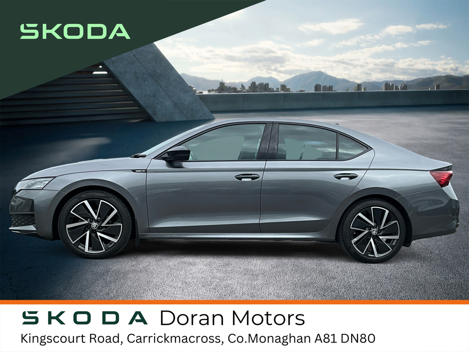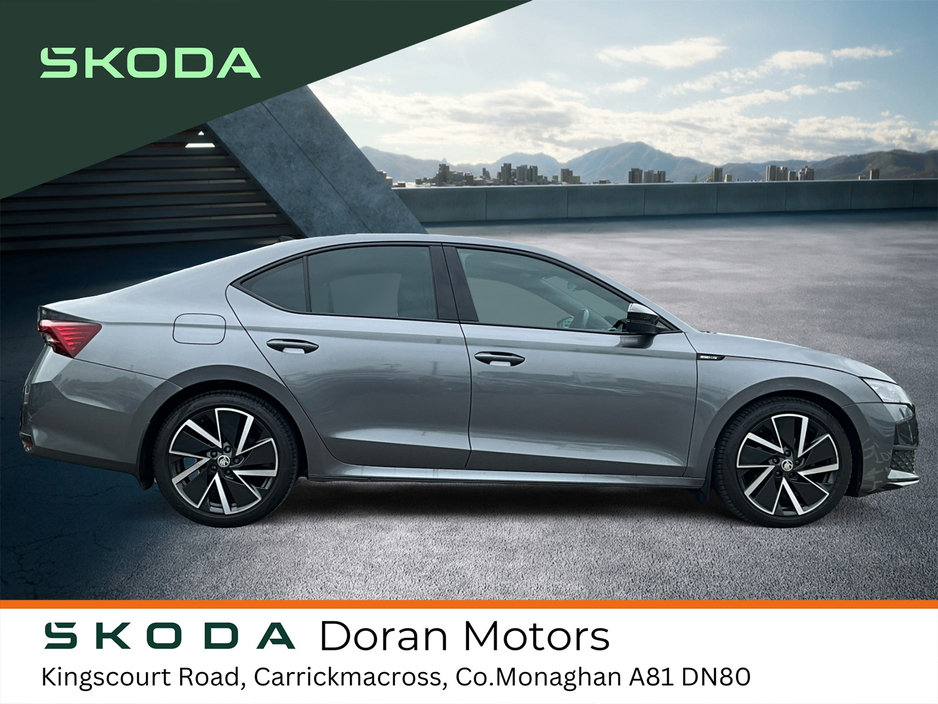 This Skoda Octavia Sportline features a sporty exterior with 19-inch aero wheels and metallic black detailing, plus a black fabric and leatherette interior with sports seats and a sports steering wheel