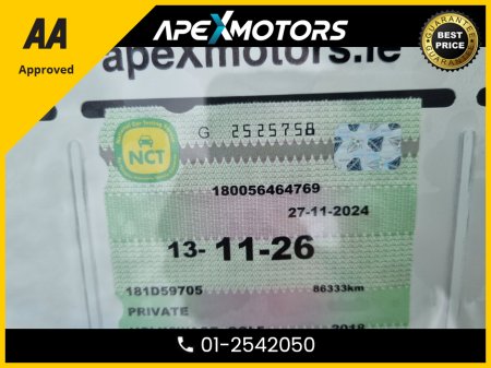 2018 Volkswagen Golf FINANCE ARRANGED * 1.4 HIGHLINE * AUTOMATIC * AA APPROVED * 101 SAFETY CHECKLIST * 12-MONTH ROADSIDE ASSIST * IMMACULATE * TOP-SPEC * LOW LOW KMs * ADAPTIVE CRUISE * NEW NCT NOV-26 * LOW TAX * ONE