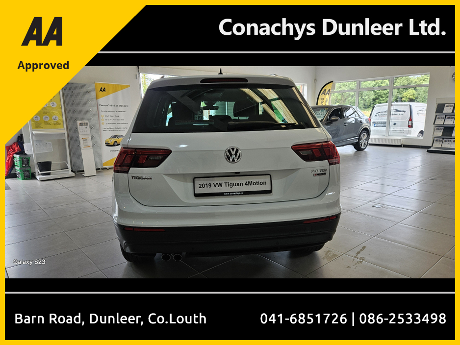 2019 Volkswagen Tiguan 2.0Tdi 4 Motion Automatic, Just into stock and awaiting Prep. Please call 0862533498 for more details Air Conditioning, Central Locking, CD Player, Immaculate condition, Electri ... c Windows, Airbag, Alloy Wheels, Cruise Control, Electric Mirrors, Fog Lamps, Immobiliser, Privacy Glass, Automatic Lights, Centre Armrest, Luggage Cover, Multi-function steering wheel, Roof Rails, Climate Control, Traction Control, Multiple Air Bags, Anti-Theft System, Parking Sensors, 12 Month Warranty, Bluetooth, Remote Central Locking, Electronic handbrake, Folding rear seats, Isofix, Hill holder, Roadside assistance, Finance Checked, Apple Car Play, Android Auto, Mirror Link, Keyless Entry, Reversing Camera, Front Parking Sensors, Wireless Smartphone Control, Stop/Start Button, Touch Screen Media Control, Drive Mode Selector, Dual Zone Climate Control, Daytime Running Lights, 2 Keys, Cup holders, Remote boot/hatch/rear door release