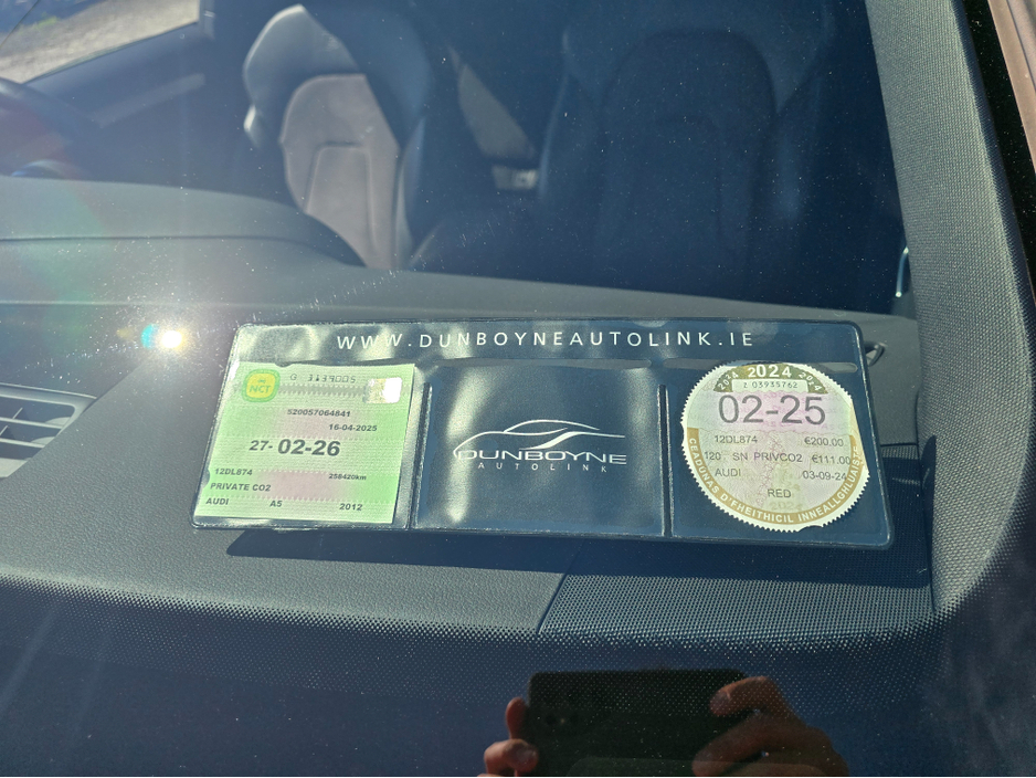 Fantastic condition 2012 Audi A5 2.0Tdi 6 speed manual 2 door Coupe S Line spec finished in Gloss Red metallic with contrasting black interior and carpets. 258,000kms or 160,000miles on the clock and just 2 owners from new. Only passed its Nct until 27-02-2026 and the annual road tax is just €200.00.
